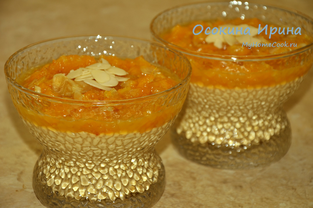6 мандаринов очистила, разделила на дольки и порезала каждую дольку поперёк на 5 - 6 частей, сложила всё в маленький сотейник, добавила 2 ст.л. мандаринового сиропа от варенья и довела до кипения, затем добавила 1 ст.л. лимонного сока и 1 ч.л. коричневого сахара и уварила почти до выпаривания лишней влаги около 7 минут, добавила горсть миндальных лепестков, промешала, сняла сотейник с огня и охладила. В чашу блендера сложила 200 г творога, 100 г творожного сыра, 2 ст.л. с верхом варёной сгущёнки и 2 ст.л. натурального йогурта, пробила до кремообразной консистенции и разложила по креманкам, поверх выложила мандариновую массу, немного настояла в холодильнике, присыпала миндальными лепестками и подала. Бесподобно вкусный и нежный десерт получился)