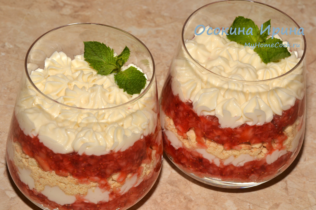 В чашу блендера влила 100 мл жирных сливок, добавила пакетик ванильного сахара, 200 г сыра "Маскарпоне" и 3 ст.л. сахарной пудры, пробила всё до состояния крема, переложила в кулинарный пакет и убрала на час в холодильник. У большого стакана мелких ягод клубники срезала хвостики, сложила в чашу блендера, добавила 1 ст.л. лимонного сока и 1 ст.л. сахарной пудры и пробила на маленькой скорости до мелких кусочков. 100 г печенья измельчила до неоднородной крошки. В сервировочные бокалы уложила слоями половину печенья, половину клубники, из кулинарного пакета отсадила половину крема и повторила слои, затем убрала всё на несколько часов в холодильник, украсила мяткой и подала. Волшебно вкусный и весьма элегантный десерт получился)