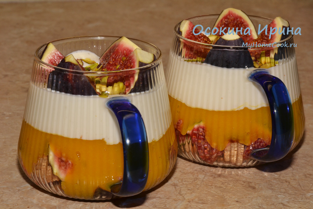 Пока ещё есть осенние фрукты, успеваем лакомится. 1 спелый манго очистила, срезала мякоть с косточки, сложила в чашу блендера и пробила в пюре. В другую чашу блендера сложила 2 ст.л. натурального йогурта, 3 ст.л. творожного сыра и 1 ч.л. с верхом мёда и пробила. Порезала не средние кусочки 2 ягоды инжира и 2 овсяных печенья, смешала и разложила по сервировочным бокалам, залила манговым пюре, поверх вылила сырную смесь, украсила разрезанными на сегменты ягодами инжира и фисташковой стружкой, настояла полчаса в холодильнике и подала. Бесподобно вкусный десерт! Идеальное сочетание вкусов и фактур),/p>