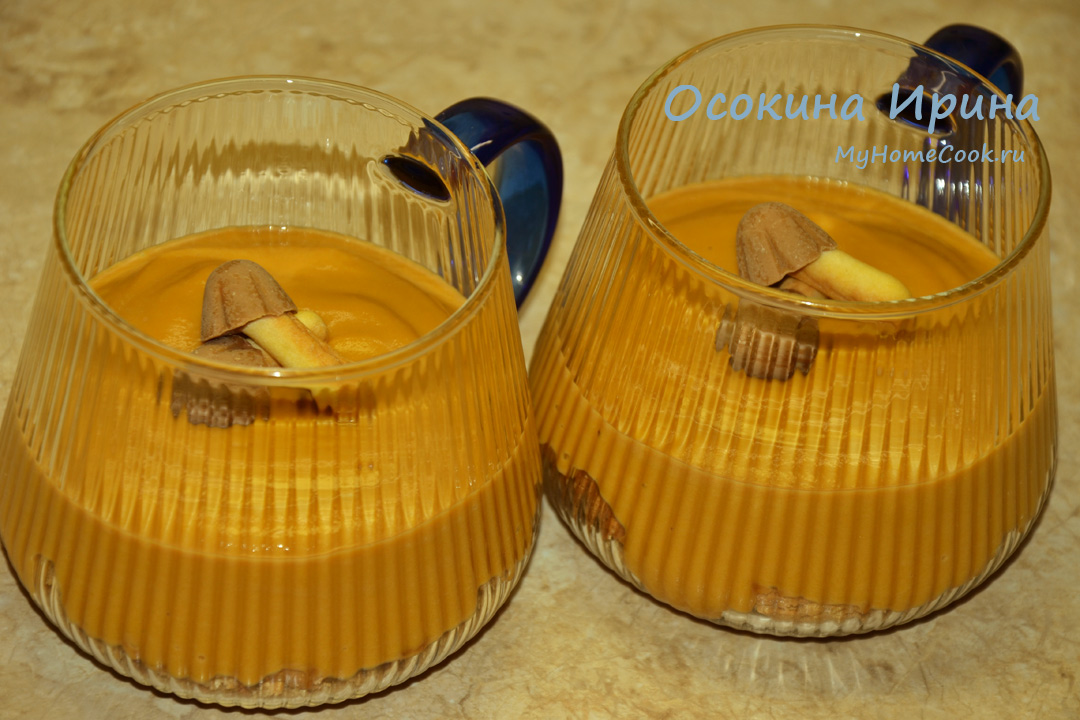 Десерты - излюбленная часть трапезы у моего супруга, более пиететно он относится только к мясным блюдам) Рецепт этого мусса бесподобно прост: в чашу блендера сложила полтора стакана тыквенного пюре (тыкву режу кубиком, отвариваю в небольшом количестве воды, откидываю на дуршлаг, перекладываю в чашу блендера, пробиваю в пюре и охлаждаю) и 2 ст.л. варёной сгущёнки и пробила до однородной воздушной массы. В сервировочные бокалы разложила поломанные овсяные печенья, поверх выложила подготовленный мусс, настояла час в холодильнике для стабилизации и подала. До смешного просто и до безумия вкусно)
