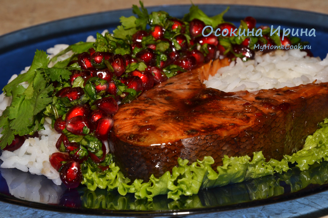 В пиалке смешала 1 ч.л. соевого соуса, 1 ч.л. сладкого соуса чили, 1 ч.л. жидкого мёда, 1 ч.л. сока лайма, 1 ст.л. соуса "Наршараб" и 1 измельчённый зубчик чеснока и промешала хорошенько. 2 стейка форели уложила в форму, густо обмазала половиной подготовленной глазури и запекла всё в духовке, разогретой до 180 градусов, в течение 20 минут. Пока запекалась рыбка в оставшуюся в пиалке смесь добавила 1 ст.л. оливкового масла и подвзбила, добавила горсть резаной кинзы, зёрна 1/3 граната и промешала. По тарелкам разложила рыбку, гарнировала отварным рисом, добавила гранатовую сальсу и подала. Ооочень вкусно нам было! Прямо пирушка)