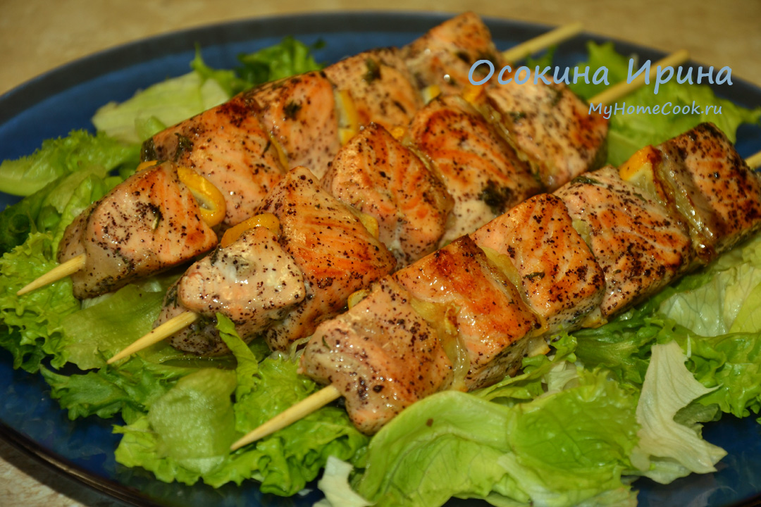В миске смешала 2 ст.л. оливкового масла, 1 ст.л. лимонного сока, 1 ч.л. листиков свежего тимьяна, 1/2 ч.л. сумаха, соль и перец по вкусу и промешала до однородности, добавила 600 г филе форели без кожи средне-крупными кубиками, аккуратно промешала и оставила подмариноваться на 30 минут. В это время нарезала тоненькие кружочки узбекского лимона и разрезала каждый пополам. На заранее замоченные в воде деревянные шпажки нанизала, чередуя кубики рыбы и сложенные пополам ломтики лимона, а затем обжарила со всех сторон до готовности на хорошо разогретой сковороде, смазанной оливковым маслом. Смесь салатным листьев сбрызнула оливковым маслом, присолила, промешала, разложила по тарелкам, поверх выложила готовые шашлычки и подала. Ооочень вкусно получилось)