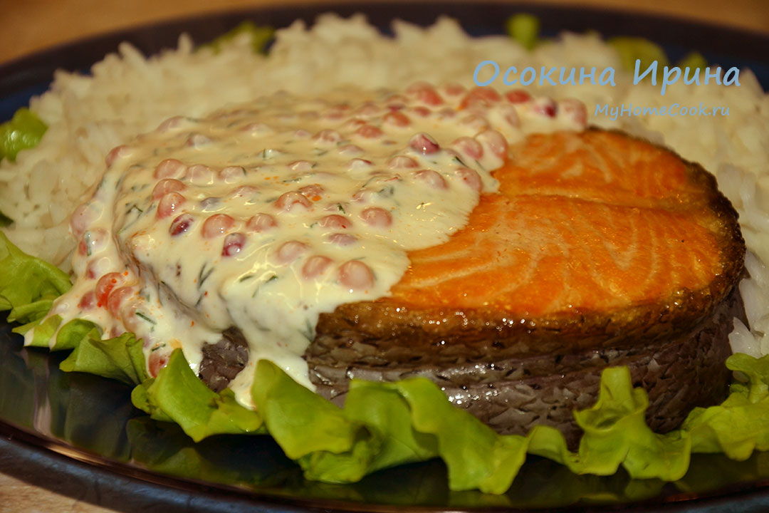 Сегодня решила приготовить стейки сёмги, но так, чтобы не пришлось вытягивать из них кости. Итак, вырезала из каждого стейка косточку. С одной стороны, начиная от пузика, отделила кожу от мякоти до половины высоты стейка, мякоть без кожи свернула рулетиком и подогнула внутрь, обернула следом всей оставшейся рыбой, а отделённой кожей обмотнула подготовленный рулетик снаружи. Готовые турнедо обвязала кулинарной бечёвкой и обжарила на топлёном сливочном масле по паре минут с каждой стороны, посолила в конце приготовления. Для соуса довела до кипения около 150 мл 10%-ных сливок, подсолила, добавила горсточку рубленного укропа, 1 ч.л. с верхом горошин розового перца, проварила минутку, добавила 2 ст.л. красной икры, сняла соус с огня и хорошенько промешала. Подавала турнедо с рисом, поливая подготовленным соусом. Лакомое блюдо получилось)