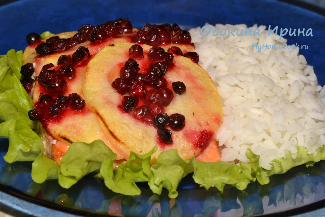В нашей семье всё ещё продолжается борьба с урожаем яблок, в этом году их так много, что это уже действительно на грани боевых действий. Но, вижу, что грамотная тактика позволяет мне заявить, что я начинаю побеждать) Тем не менее яблок ещё много и я продолжаю готовить с ними: сегодня сочетаю с яблоками форель. Итак, крупное садовое яблоко очистила, нарезала на кружочки, вырезала семенную коробочку и щедро сбрызнула лимонным соком. Порционные ломти филе форели на коже посолила, поперчила, уложила в устланную пекарской бумагой форму, поверх уложила внахлёст кружочки яблок, посыпала свежей брусникой, сбрызнула оливковым маслом и запекла в духовке, разогретой до 180 градусов, в течение 15 минут. Подавала с рисом. Просто, быстро и ооочень вкусно)