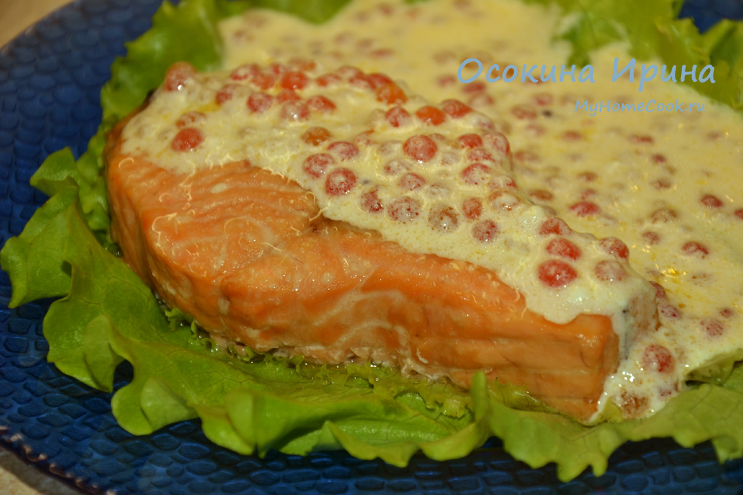 Филе форели на коже разрезала на ломти толщиной около 5 - 6 см, надрезала каждый пополам вдоль, но не насквозь, а до кожи и свернула кожей внутрь и получились стейки-бабочки. уложила и в форму, посолила, сбрызнула оливковым маслом и запекла в духовке, разогретой до 180 градусов, в течение 12 минут. Пока запекалась рыба, приготовила соус: в маленьком сотейнике распустила 30 г топлёного сливочного масла, добавила 2 ст.л. сметаны 2 ст.л. творожного сыра, промешала до растворения сыра, добавила 1 ч.л. лимонного сока, промешала, довела до первого булька, добавила 2 ст.л. красной икры, промешала и сняла соус с огня. Подавала рыбку, поливая соусом, с подсушенным ломтиком зернового хлеба. Ооочень вкусно нам было)