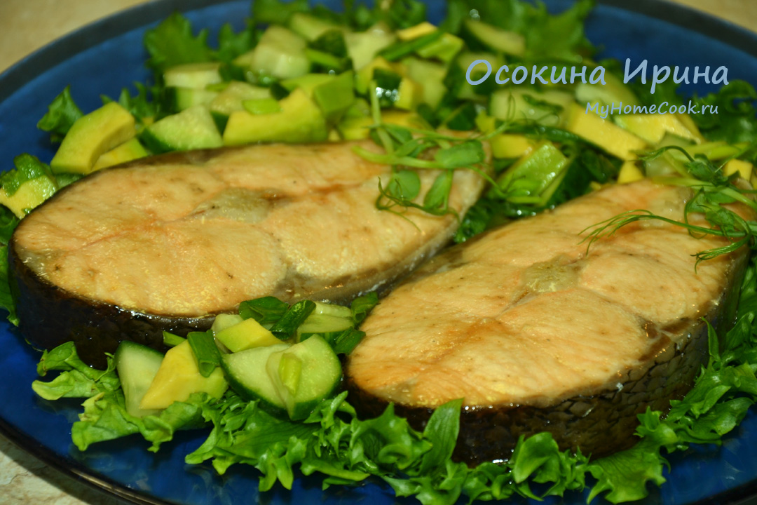 Стейки сёмги обмазала кунжутным маслом, посолила, оставила на 20 минут подмариноваться, затем переложила в форму и запекла в духовке, разогретой до 180 градусов, в течение 7 минут. В это время в пиалке смешала 1 ст.л. мёда и 1 ч.л. соевого соуса, промешала, затем добавила 1/2 ч.л. кукурузного крахмала, снова промешала и прогрела всё в микроволновке 30 секунд. Достала форму из духовки, смазала рыбу подготовленной глазурью и вернула в духовку ещё на 7 - 8 минут. На гарнир подала салатик для которого в миске смешала по 1 ст.л. кунжутного масла и рисового уксуса, добавила по 1 ч.л. соевого соуса, дижонской горчицы и сока лайма, промешала всё до однородности, добавила 2 резаных огурца и 1 авокадо, промешала, добавила большую горсть резаного зелёного лука и ещё раз промешала. Очень интересно и вкусно получилось)