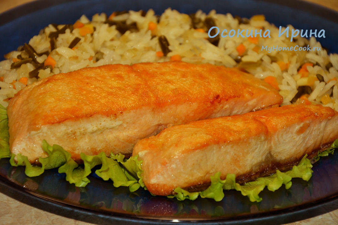 Для гарнира в сотейнике обжарила 1 рубленную луковицу и 1 морковку мелким кубиком, добавила около 2/3 стакана чесночных стрелок из заморозки (в сезон режу на кусочки и замораживаю порциями) и обжарила всё вместе, добавила отварной рис, подсолила, промешала и прогрела всё вместе. Филе сёмги на коже порезала на порционные куски, обсыпала кукурузным крахмалом, уложила на разогретую с топлёным сливочным маслом сковороду кожей вниз, жарила около 4-х минут, перевернула кожей вверх, посолила, жарила ещё 2 - 3 минут, снова перевернула, посолила со второй стороны, а через минуту подала с подготовленным рисом. Бесподобно вкусная рыбка! С идеально хрустящей корочкой и нежной мякотью, а за кожу вообще драчка случилась)