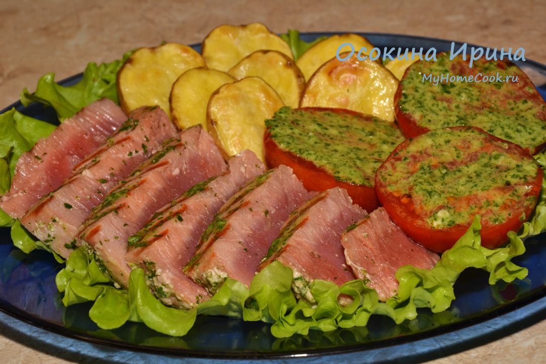 В чашу блендера сложила горсть резаной произвольно петрушки, вполовину меньше резаного базилика, резаный зубчик чеснока, 1 ст.л. оливкового масла, 1 дес.л. яблочного уксуса и 1 дес.л. воды, добавила щепотку соли и пробила. 2 стейка тунца толщиной около 3 см каждый обмазала половиной этой смеси и обжарила на хорошо разогретой сковороде-гриль по паре минут с обеих сторон, а затем сняла со сковороды и накрыла фольгой, а на сковороде обжарила 3 разрезанные пополам помидорки срезами вниз, сняла помидоры со сковороды, уложила срезами вверх и смазала оставшейся зелёной смесью. Тунца порезала на слайсы, выложила на тарелки, гарнировала подготовленным помидорами и запечённой половинками картофельной мелочью. Было бесподобно, просто безумно вкусно)