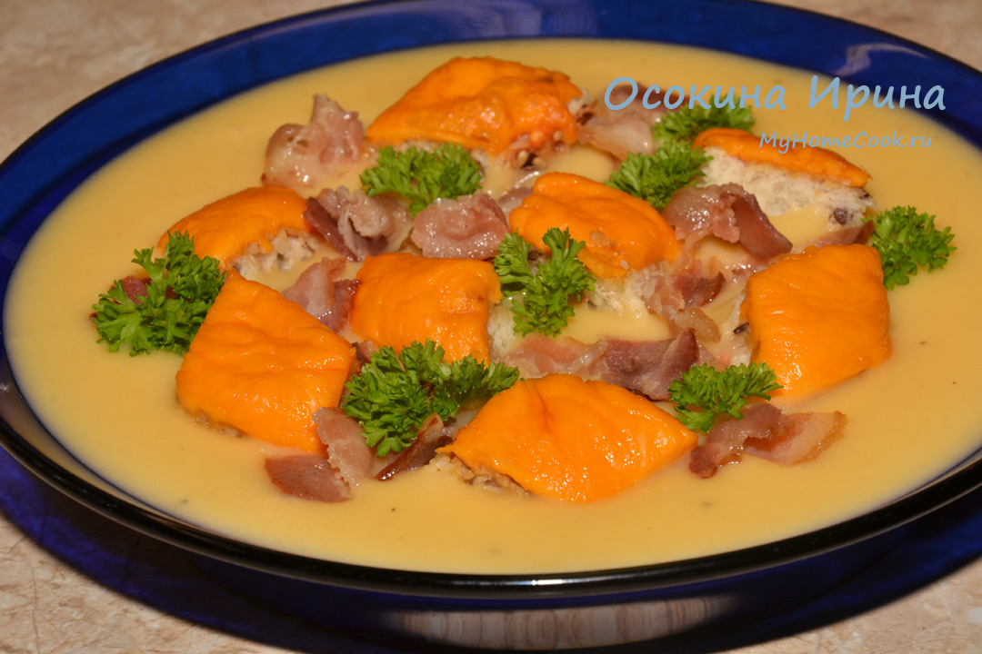 В кастрюле выжарила 4 резаные полоски бекона, бекон достала, а в оставшийся жир добавила 2 резаные картофелины, обжарила, добавила 5 очищенных резаных садовых яблок, промешала, прогрела всё вместе, влила кипяток и варила минут 12 - 15 до полной готовности, сняла кастрюлю с огня, посолила, поперчила, пробила погружным блендером и порциями, продолжая пробивать, добавила 100 г сыра "Красный чеддер" на мелкой тёрке, доведя до его растворения, вернула кастрюлю на огонь, довела до первого булька, накрыла кастрюлю крышкой, сняла с огня и немного настояла. Пока варился суп отрезала пару ломтей зернового хлеба, смазала их дижонской горчицей, посыпала тёртым "Чеддером" же и запекла в духовке, разогретой до 180 градусов, в течение 12 минут, достала, охладила и порезала ромбиками. Разлила суп по тарелкам, добавила гренки, посыпала обжаренным ранее беконом, посыпала петрушкой и подала. Ооочень вкусный, ароматный и даже сливочный супчик получился)