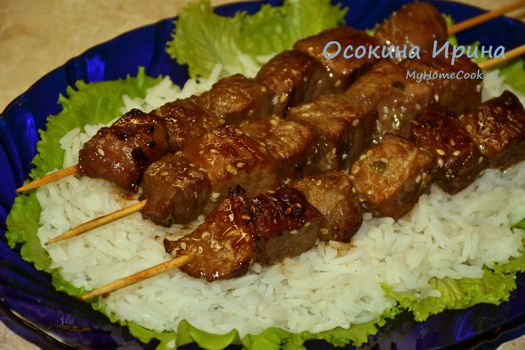 Зимой люблю готовить различные шашлычки в духовке, не мангал с дымком, конечно, но тоже очень хорошо) В миске смешала 5 ст.л. соевого соуса, 3 ст.л. оливкового масла, 2 ст.л. коричневого сахара, 1 ст.л. кунжута, 1 ч.л. измельчённого имбиря, горсть резаного зелёного лука и 1 измельчённый зубчик чеснока, промешала хорошенько и замариновала в этом 400 г телятины средним кубиком на час, затем нанизала на заранее замоченные в воде деревянные шпажки и обжарила на раскалённой смазанной маслом сковороде по 1 - 2 минуты с каждой стороны до готовности мяса. Пока обжаривались шашлычки, оставшийся маринад влила в маленький сотейник и уварила вдвое. Подавала шашлыки на подушке из риса и с соусом. Бесподобно вкусно! Прямо погурманили)