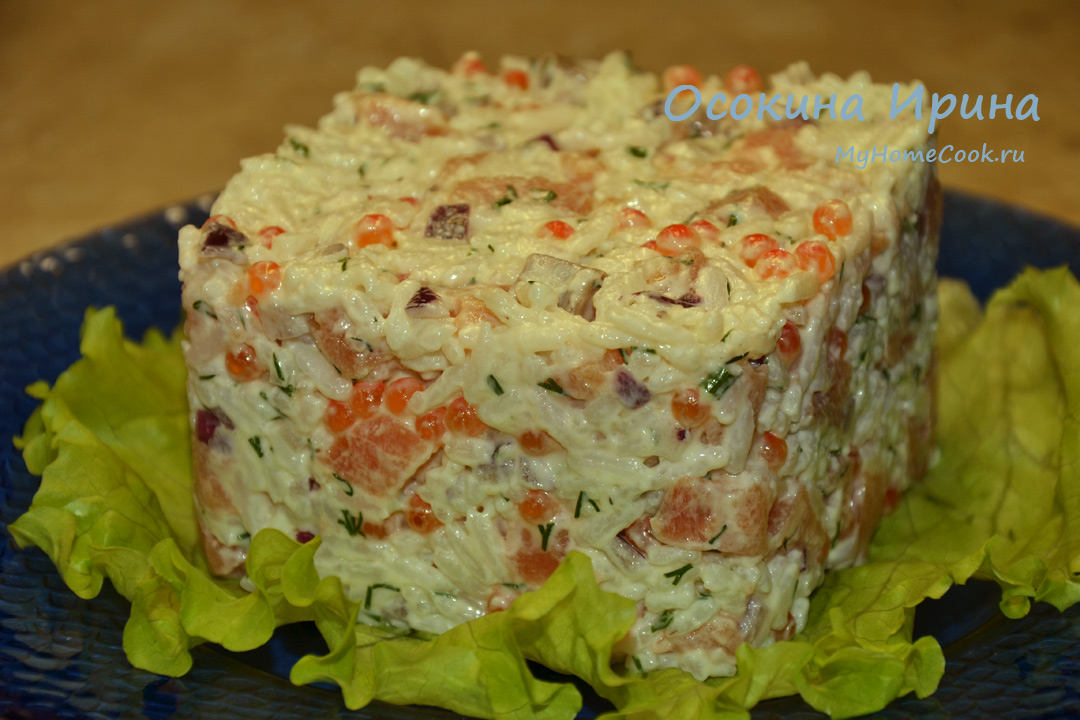 Купили икорную форель, засолила больше полкило икры, поэтому добавляю её буквально везде) Например, в такой салат: в миске смешала 100 г натурального йогурта, 1 ст.л. с верхом творожного сыра и 2 ст.л. оливкового масла, промешала венчиком до однородности, добавила 1 стакан отварного холодного риса, снова промешала, затем добавила мелко рубленную красную луковичку, 1 ст.л. резаного укропа и 150 г слабосоленой форели кубиком, снова промешала, настояла полчаса в холодильнике, затем добавила 1 ст.л. с верхом красной икры, ещё раз промешала всё и сразу подала. Очень вкусный получился салатик)