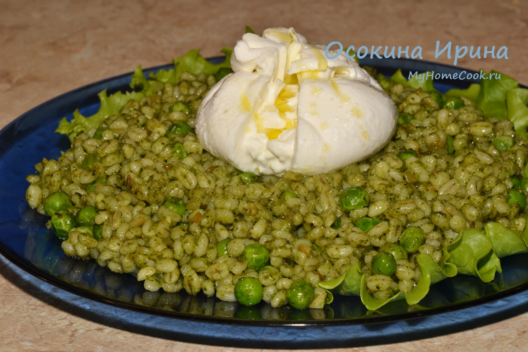 В сотейнике на оливковом масле обжарила 1 резаную луковицу, добавила несколько веточек тимьяна и мелко рубленный зубчик чеснока, обжарила всё, затем добавила 3 бочоночка (около 30 г) измельчённого шпината из заморозки, промешала, погрела, затем добавила 2 стакана заранее отваренной перловки, помешала, прогрела, посолила, поперчила, добавила 2 ст.л. оливкового масла, промешала, через пару минут добавила 150 г замороженного зелёного горошка, промешала, прогрела всё вместе ещё пару минут, накрыла сотейник крышкой, сняла с огня, немного настояла, разложила перловку по тарелкам, в каждую добавила по шарику "Бурраты", надрезала её, полила всё оливковым маслом и сразу подала. Безумно вкусное блюдо получилось! Всё, вроде, просто, но неотразимо в сочетании)