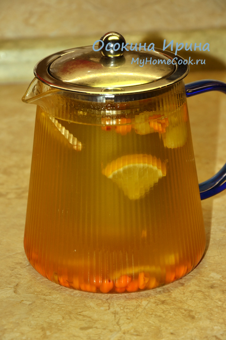 И снова морозы на Урале, и снова тема горячих напитков на пике. А если чаёк ещё и полезный, то вообще мечта! В чайник сложила несколько ломтиков корня имбиря, пару резаных кружочков лимона и пару горстей замороженной облепихи и помяла толкушкой, установила колбу, положила в неё 1 ст.л. заварки зелёного чая, залила кипятком, укутала и оставила на 20 минут. При подаче в каждую кружку добавила по 1 ч.л. мёда. Очень вкусно и очень полезно)