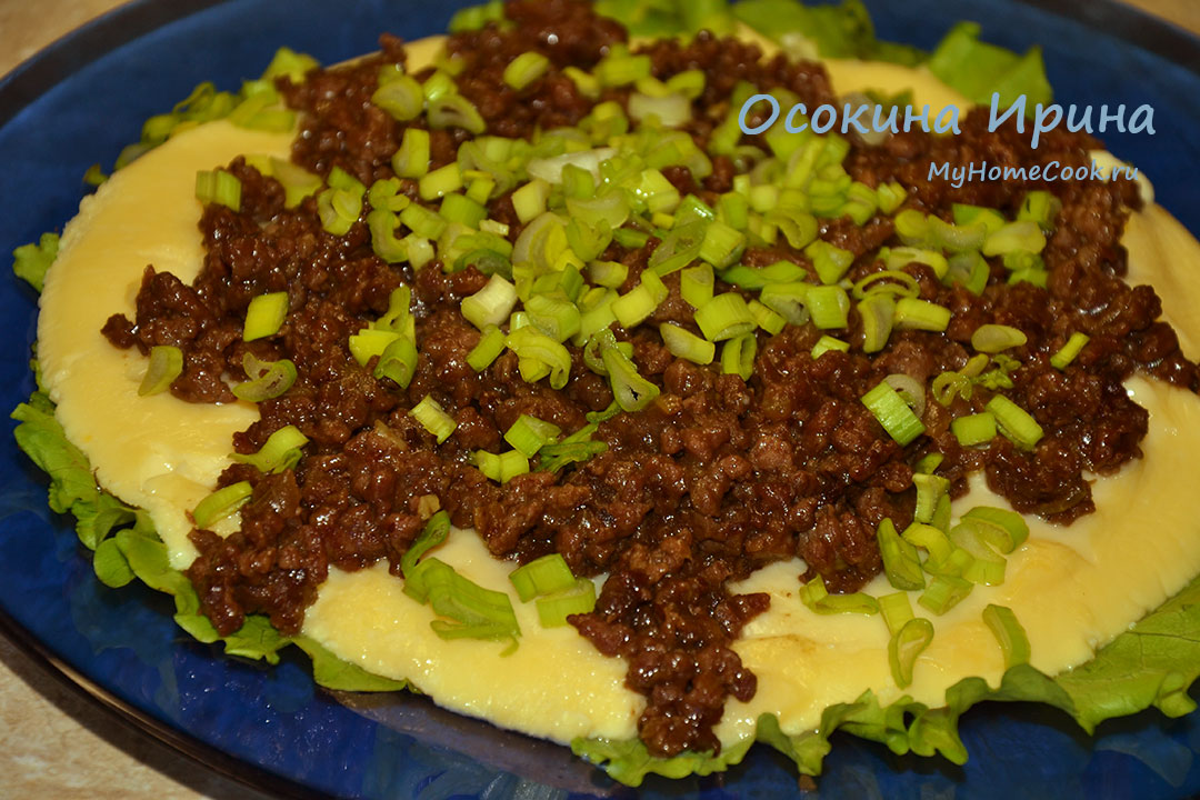 На 1 порцию в миске взбила 3 яйца с 1 стаканом тёплой воды и солью по вкусу, ситечком сняла пену, чтобы омлет впоследствии был гладким, влила в смазанную оливковым маслом миску, установила на водяную баню, накрыла крышкой и готовила 12 минут. Для мясной составляющей на 2 порции на растительном масле обжарила 1 рубленную луковицу, добавила 0,5 кг домашнего говяжьего фарша, обжарила, разбивая комочки, до выпаривания влаги, добавила 2 ст.л. устричного соуса, 2 ч.л. соевого соуса и 1/2 ч.л. коричневого сахара, промешала, прогрела, влила смесь 3 ст.л. воды и 1 ч.л. кукурузного крахмала, промешала, прогрела и сняла с огня. Готовый омлет переложила на тарелку, поверх выложила мясной соус, посыпала резаным зелёным луком и подала. Омлет получился очень нежный, по консистенции мягкий, сочный и дрожащий как студень. В сочетании с мясной поджаркой - великолепие вкусов и фактур)