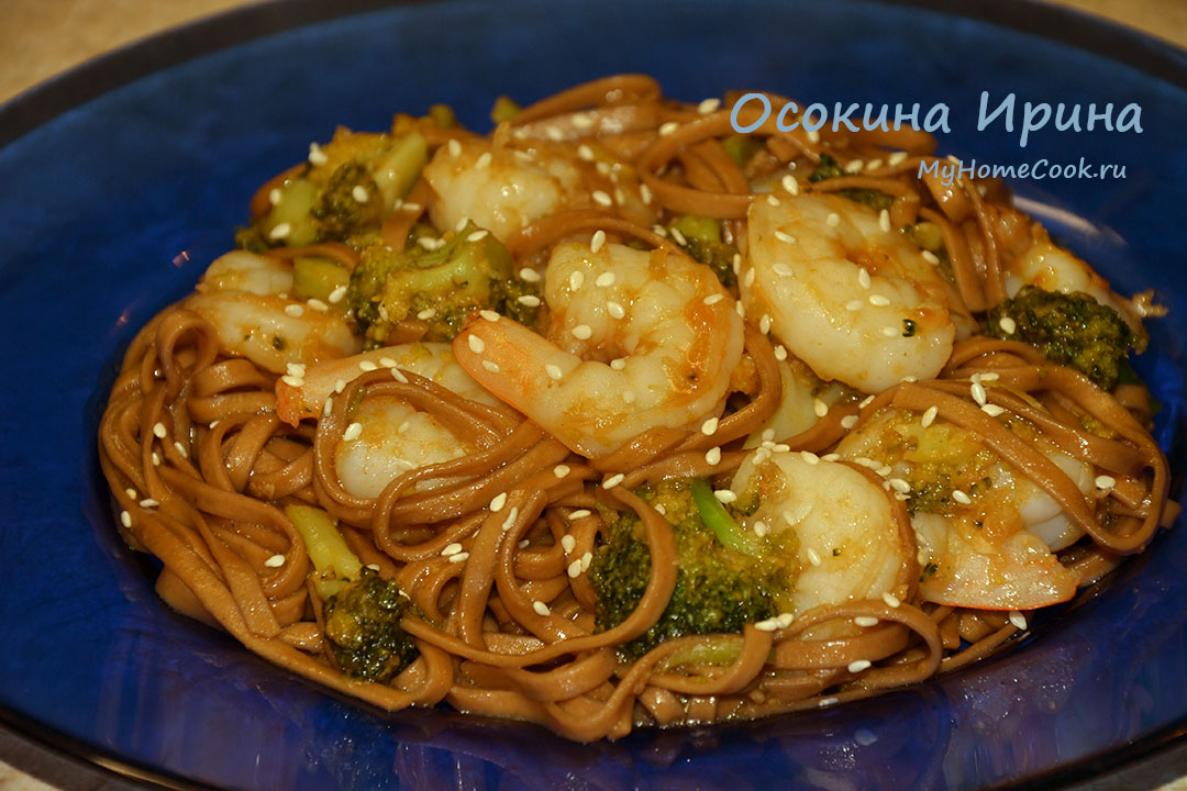 В сковороде вок раскалила оливковое масло, быстро обжарила 1 ч.л. с верхом измельчённого имбиря и 2 рубленных зубчика чеснока, добавила 350 г полуразмороженной брокколи, также обжарила минуту-другую, вокруг по стенкам обложила 250 г крупных очищенных креветок, через минуту их перевернула, через 30 секунд всё промешала, добавила 3 ст.л. соуса "Пад тай" и 1 ст.л. соевого соуса, промешала, затем добавила заранее отваренную, промытую под холодной водой и обсушенную собу (гречневую лапшу) и ещё раз промешала, сразу разложила по тарелкам, припорошила кунжутом и подала. Быстро, просто, но как же это вкусно)