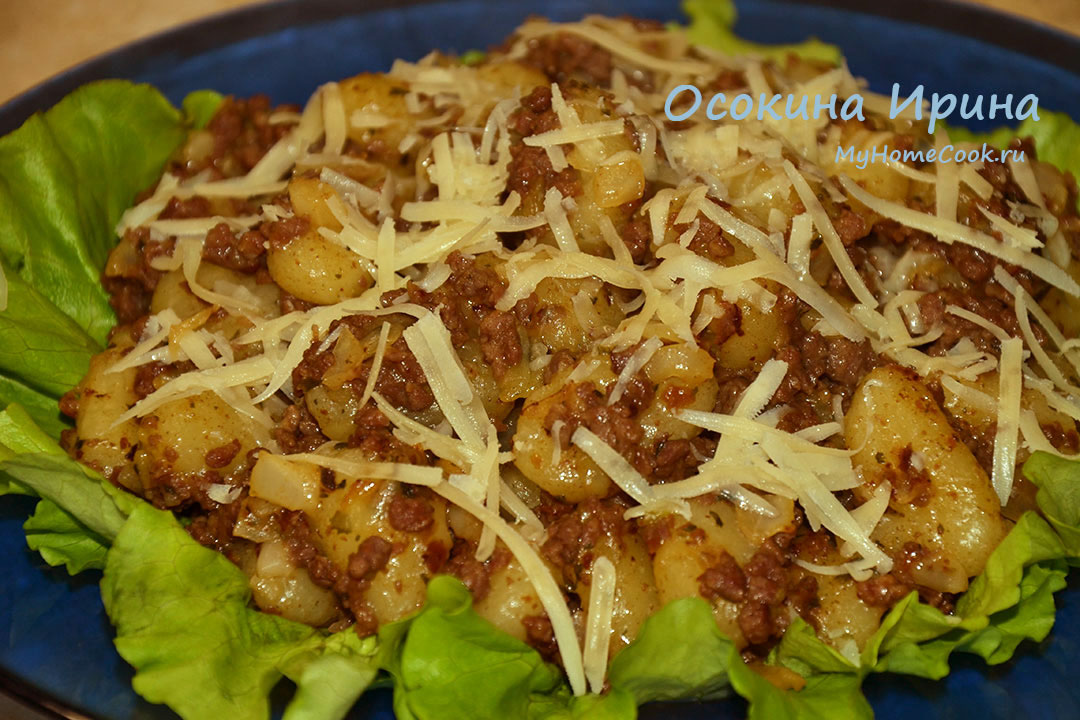 Ньокки для меня вариант быстрого ужина, когда времени и сил после работы просто не хватает. У нас в "Магните" продают по хорошей цене упаковки (500 г) готовых ньокки разных размеров, сегодня у меня крупные. В сотейнике на растительном масле обжарила 1 рубленную луковицу, добавила 400 г свежекрученного говяжьего фарша, обжарила, разбивая комочки, затем добавила грамм 200 резаной кубиком свежей капусты и 1 ч.л. сушеной петрушки, промешала, обжарила, посолила, поперчила, влила немного кипятка и готовила под крышкой до мягкости капусты, добавила 0,5 кг отваренных в посоленной воде покупных ньокки, промешала, прогрела, добавила горсть тёртого пармезана, промешала, разложила по тарелкам, посыпала тёртым пармезаном и сразу подала. Быстро, просто и необычайно вкусно)