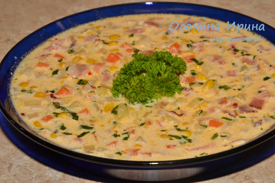 Чаудер - это густой сливочный суп американского происхождения, который чаще всего готовится из морепродуктов, картофеля, лука и сливок или молока. Существуют и другие разновидности, например, кукурузный или овощной чаудер. У меня сегодня чаудер с беконом и кукурузой. Итак, в кастрюле выжарила 5 резаных полосок бекона, добавила 1 рубленную луковицу и 1 морковку кубиком, обжарила всё месте, влила кипяток, как закипело добавила 1 ч.л. сушеного сладкого перца и половина очищенного кабачка кубиком, через пару минут добавила срезанные с одного початка зёрна кукурузы, варила всё минут 7, посолила, поперчила, добавила горсть резаной петрушки, промешала, влила 150 мл жирных сливок, как снова стало закипать, накрыла кастрюлю крышкой, сняла с огня, немного настояла и подала. Очень вкусный и сливочный получился супчик)