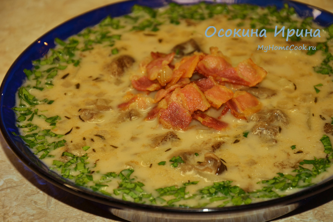 Прибиралась в морозилке, обнаружила в углу пакетик замороженных маслят и решила на их основе сварить супчик. В кастрюле на топлёном сливочном масле обжарила 1 рубленную луковицу и 1 стебель сельдерея кубиком с добавлением 1/2 ч.л. сушеного тимьяна, влила 50 мл сухого белого вина, выпарила его, добавила 2/3 стакана размороженных резаных маслят, прогрела, влила кипяток, как снова закипело, добавила 1 крупную резаную картофелину, варила до её мягкости, посолила, поперчила, добавила 1 ст.л. плавленого сыра из ванночки, промешала до его растворения, накрыла кастрюлю крышкой, сняла с огня, немного настояла и подала с резаной петрушкой. Очень вкусный и ароматный получился супчик! В тарелку супруга добавила ещё и выжаренный до хруста резаный бекон - ну не может мой мясоед без этого)
