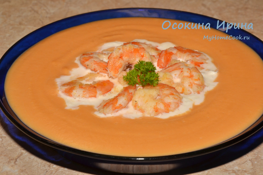 Когда хочется не просто супа, а чего-то особенного, то можно приготовить, например, так: 300 г крупных креветок очистила, головы выкинула, а на панцирях сварила бульон, процедила его, перелила в кастрюлю довела до кипения, добавила 2 резаных батата и 1 резаную картофелину, варила всё до готовности, посолила, влила 100 мл жирных сливок и пробила погружным блендером до гладкости, сразу разлила по тарелкам, на середину супа разложила баночку "Страчателлы", поверх разложила обжаренные на топлёном сливочном масле креветки и сразу подала. Божественно вкусное первое блюдо получилось)