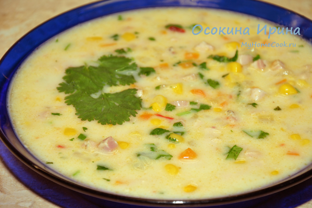 - Острый кукурузный суп - И снова у нас на столе осенний ароматный суп: в кастрюле обжарила 1 рубленную луковицу, 1 морковку кубиком, 1 ч.л. с верхом резаного маринованного красного перца "Халапеньо" и 1 резаный стебель сельдерея, влила немного кипятка, довела до кипения, добавила 150 г рулеты из индейки кубиком, 1/2 ч.л. молотой зиры и 1/2 ч.л. сушеного чеснока, варила всё 10 минут, влила банку (400 г) кокосового молока, посолила, довела до кипения, затем добавила 1 банку консервированной кукурузы, через пару минут добавила горсть резаной кинзы, промешала, накрыла кастрюлю крышкой, сняла с огня, немного настояла и подала. Вкусный, будоражащий рецепторы и согревающий душу супчик получился) - Приятного аппетита