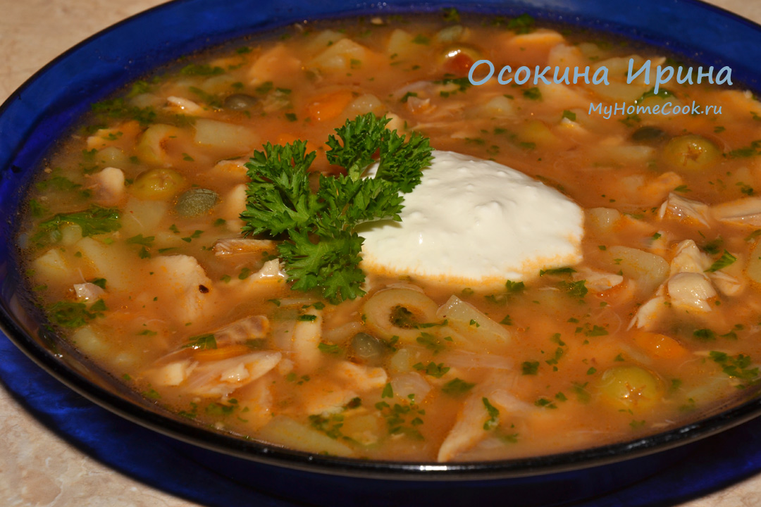 Супы на копчёной рыбке очень любимы в нашей семье, давно не готовила, надо было исправить эту вопиющую несправедливость. На полутушке терпуга горячего копчения сварила бульон, достала рыбку и обобрала мякоть с костей, а бульон процедила. В другой кастрюле обжарила 1 луковицу соломкой вдоль и половину резаной морковки, влила бульон, довела до кипения, добавила 1 резаную картофелину, варила 5 минут, вернула рыбку, через 5 минут добавила 1 ч.л. с верхом обжаренной томатной пасты, дюжину резаных оливок и 1 ст.л. каперсов и 1 дес.л. заливки от каперсов, досолила, поперчила, через пару минут добавила горсточку резаной петрушки, накрыла кастрюлю крышкой, сняла с огня, немного настояла и подала со сметанкой. Очень вкусный супчик получился)