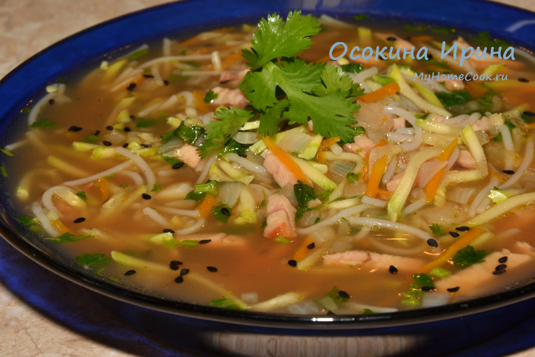 Сегодня на улице совсем пасмурно, захотелось отогреть душу, решила сварить простой суп-лапшу, но в процессе нарезки лука что-то меня сподвигло переиначить всё в паназиатскую сторону. Получилось вот что: в кастрюле на растительном масле обжарила 1 рубленную луковицу, добавила небольшую морковку на корейской тёрке, обжарила всё вместе, влила кипяток, затем добавила 100 г рулета из индейки тонким брусочком, минуты через 3 влила 2 ст.л. соевого соуса, добавила грамм 30 поломанной рисовой лапши, через минуту добавила половину молоденького кабачка на корейской тёрке, ещё через минуту добавила 2 ст.л. устричного соуса, горсть резаной кинзы, промешала, накрыла кастрюлю крышкой, сняла с огня, немного настояла и подала, посыпав чёрным кунжутом. Очень вкусный супчик получился)