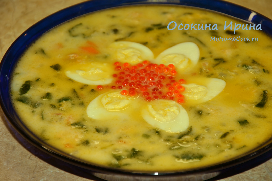На хвостике форели сварила бульон, рыбку достала, сняла мякоть с костей и разобрала на кусочки, а бульон процедила. В другой кастрюле на топлёном сливочном масле обжарила 1 рубленную луковицу и 1 маленькую резаную морковку, влила бульон, довела до кипения, вернула рыбку, посолила, поперчила, добавила 100 г резаного свежего шпината, варила всё вместе пару минут, добавила 100 г плавленого сыра их ванночки, промешала до его растворения, накрыла кастрюлю крышкой, сняла с огня, немного настояла и подала, сервируя каждую тарелку половинку отварных перепелиных яиц и красной икрой. Супчик получился просто гурманский)