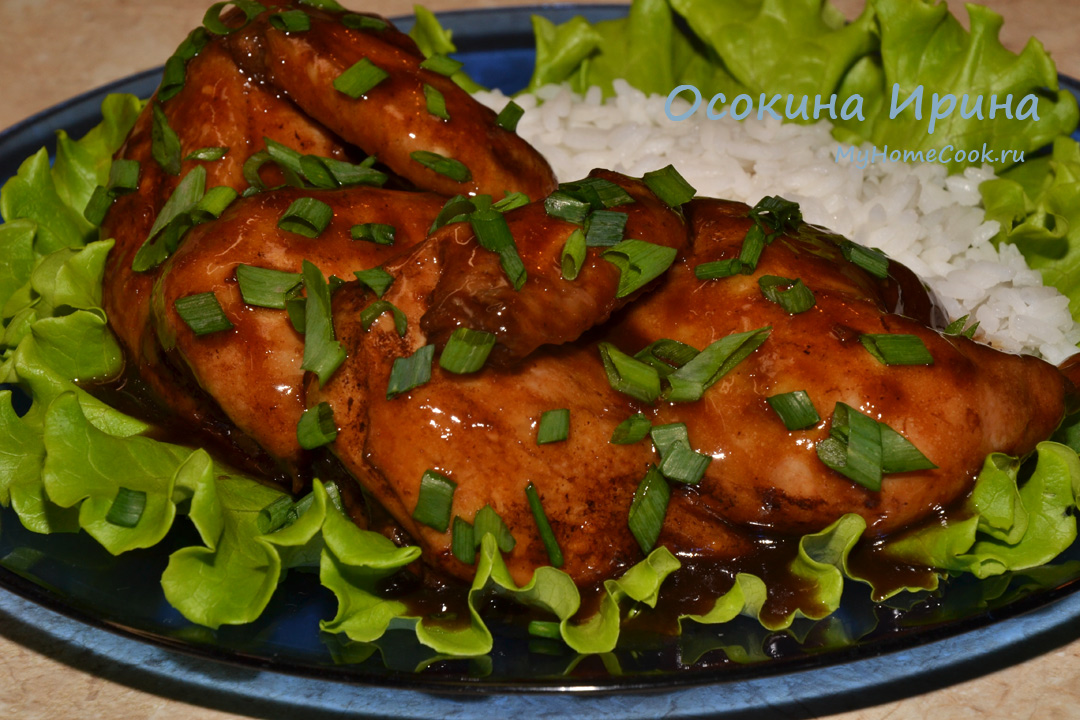 У двух цыплят-корнишонов (около 500-600 г каждый) вырезала позвоночники, разрезала вдоль пополам, обрезала крайние фаланги крыльев и обрубила суставчики на ножках. В миске смешала 1/2 стакана соевого соуса, 1/4 стакана коричневого сахара, 1/3 стакана "Мирина" и влила 1 стакан воды, добавила 4 измельчённых зубчика чеснока и 1 ст.л. измельчённого имбиря и промешала хорошенько до растворения сахара, вылила смесь в сотейник, уложила подготовленных цыплят, довела до кипения, накрыла кастрюлю крышкой и тушила всё на минимальном огне в течение 40 минут, один раз перевернув цыплят, после чего достала их, а бульон уварила вполовину в течение 15 минут, добавила в него 1 ст.л. с верхом кукурузного крахмала, разведённого в 3 ст.л. воды, промешала до загустения, вернула цыплят, прогрела, обваляла в соусе и подала с рисом, густо поливая вкуснейшим соусом и посыпая резаным зелёным луком. Бесподобная вкуснятина получилась)