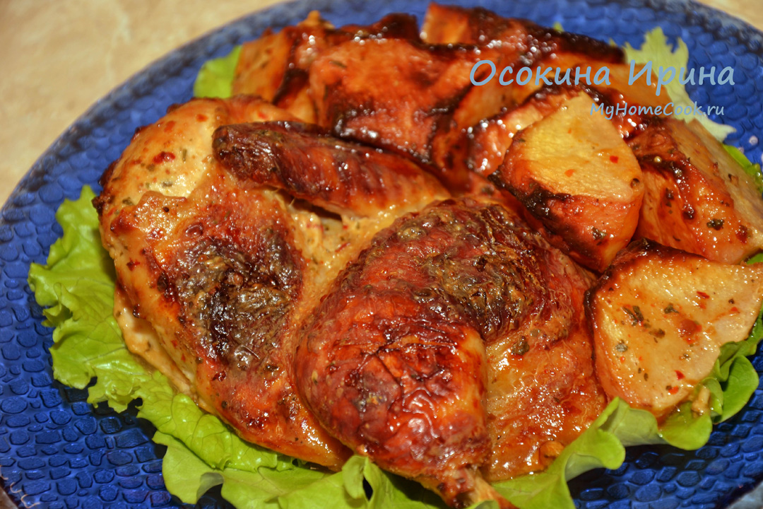 Очень любим цыплят-корнишонов - маленьких птичек весом 500-600 г, покупаю их при удобном случае и жарю или запекаю. В этот раз такой вариант: вчера в миске смешала 2/3 стакана сметаны, 1 ч.л. с горкой перечной аджики, 1 ч.л. смеси сушеных кавказских травок, 1 ч.л. сушеного чеснока, соль по вкусу и промешала. У двух цыплят-корнишонов вырезала позвоночники, располовинила вдоль по грудке, добавила в миску к маринаду, промешала и убрала в холодильник, сегодня переложила цыплят в форму, в миску с остатками маринада добавила 1 крупную резаную айву (семенную коробочку конечно вырезала) и промешала, обложила кусочками айвы половинки цыплят в форме, затянула форму фольгой и запекла в духовке, разогретой до 180 градусов, в течение 30 минут, затем сняла фольгу и вернула форму в духовку ещё на 30 минут. Пряно, сочно, ароматно и вкуснооо)
