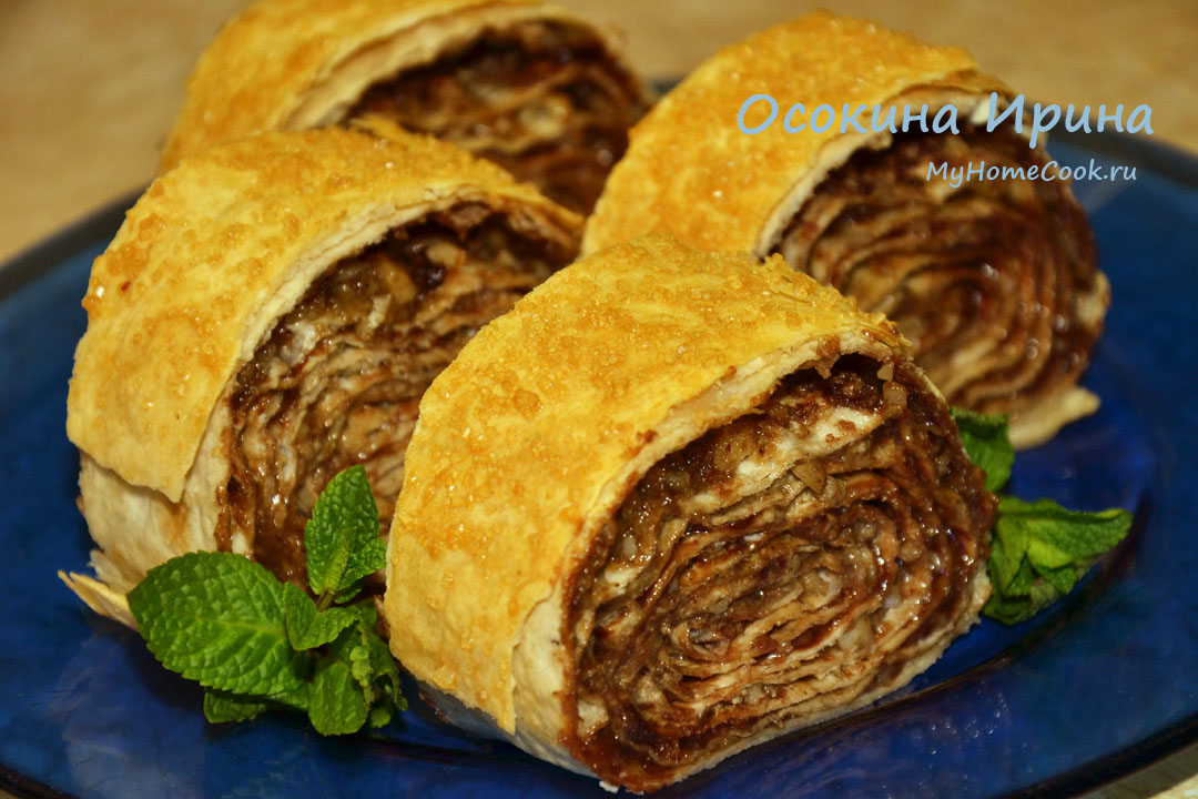 В чашу блендера сложила 150 г халвы и большую горсть грецких орехов и пробила всё в крупную крошку. Тонкий лист лаваша тоненько смазала размягчённым сливочным маслом, поверх смазала всё шоколадно-ореховой пастой, посыпала подготовленной ореховой крошкой, свернула лаваш рулетом, переложила в форму, смазала остатками сливочного масла, обсыпала коричневым сахаром и запекла всё в духовке, разогретой до 180 градусов, в течение 17 минут, достала, охладила, порезала и подала. Просто, быстро и ооочень вкусно получилось)