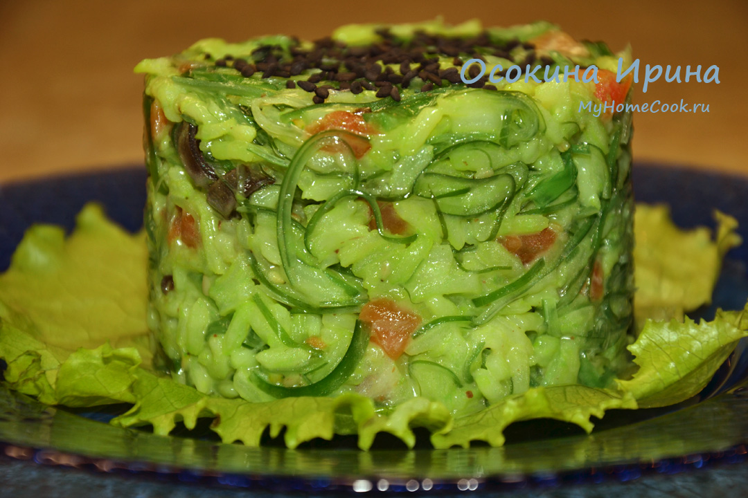 Салат "Чука" - готовый салат из бурых водорослей вакаме. С японского его название, что интересно, переводится как "Китайский". Он продаётся уже готовым в различной фасовке, в баночках или пакетах. Но есть его просто с ореховой заправкой поднадоедает, поэтому я готовлю с ним разные салаты. В миске смешала 3/4 стакана отварного риса, 200 г готового салата "Чука" и 100 г слабосоленой форели кубиком, промешала, заправила 3 ст.л. готового орехового соуса, промешала, немного настояла и подала, присыпая каждую порцию кунжутом. Просто и очень вкусно)