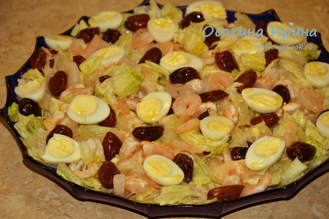 Подобные салаты готовлю довольно часто, на все праздники, потому что любим подобные сочетания всей нашей большой семьёй. Сегодня такой вариант: смешала 3 ст.л. натурального йогурта с 1 ч.л. дижонской горчицы, 1/2 ч.л. лимонного сока и 1 ч.л. оливкового масла, подсолила и промешала до однородности. Порезала 1/2 кочанчика салата "Айсберг" и выложила слоем на большое блюдо, полила заправкой, добавила 200 г размороженных креветок и слегка промешала, поверх разложила 100 г оливок "Каламата" и половинки отварных перепелиных яиц и сразу подала. Простой и очень вкусный салат)