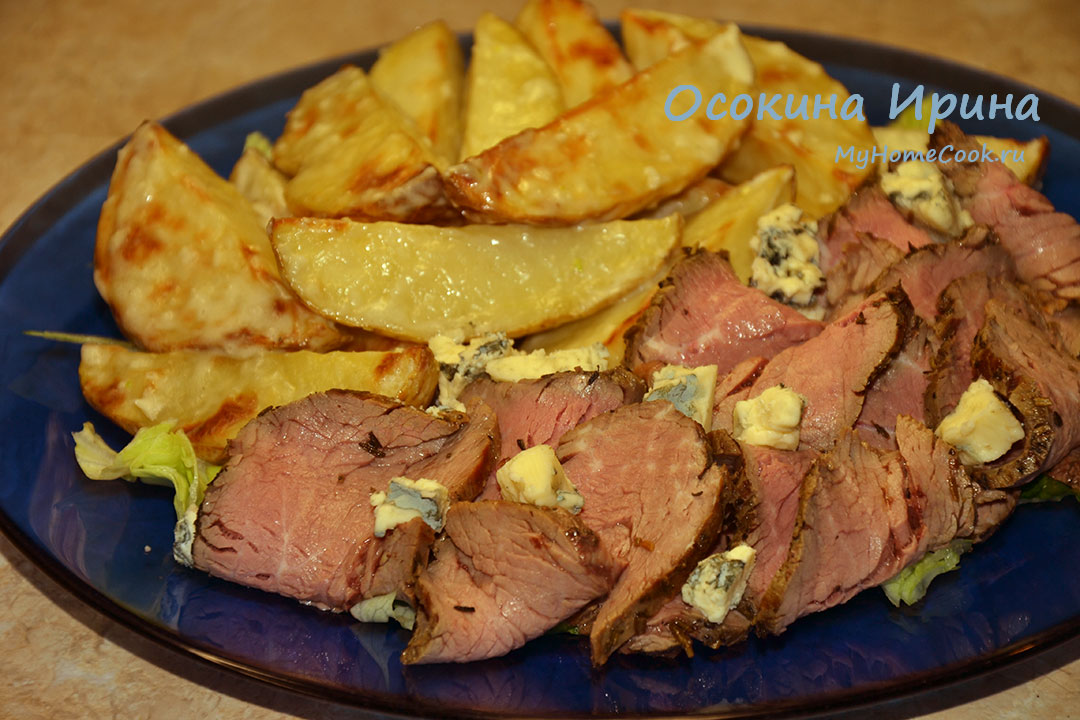 Молодой картофель промыла щёткой, разрезала на 4 части вдоль, полила растительным маслом, посолила, промешала, переложила в форму и запекла в духовке, в течение 30 минут до готовности. Пока запекался картофель, в чашу блендера сложила 30 г сыра с голубой плесенью, добавила 1 ст.л. с верхом натурального йогурта, 1 резаный зубчик чеснока и пробила до однородности. Только что приготовленную картошку сложила в миску, добавила соус, промешала, сразу разложила по тарелкам, добавила тонкие ломтики ростбифа из говяжьей вырезки (можно любое мяско) и сразу подала. Ооочень вкусно нам было)