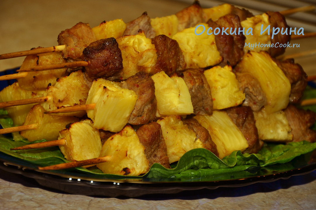 В миске смешала 1 ст.л. дижонской горчицы, 1 ст.л. лимонного сока, 2 ст.л. соевого соуса, 2 ст.л. оливкового масла, 1 ч.л. копчёной паприки, 1/2 ч.л. сушеного чеснока, хорошую щепоть чили, соль и перец по вкусу, промешала всё венчиком до однородности и замариновала в этом 600 г свиной шейки небольшими кусочками на несколько часов, после этого нанизала мяско на заранее замоченные в воде деревянные шпажки, чередуя с кусочками свежего ананаса, переложила в форму и запекла в духовке, разогретой до 180 градусов, в течение 25 минут. Обалденная вкуснятина получилась)