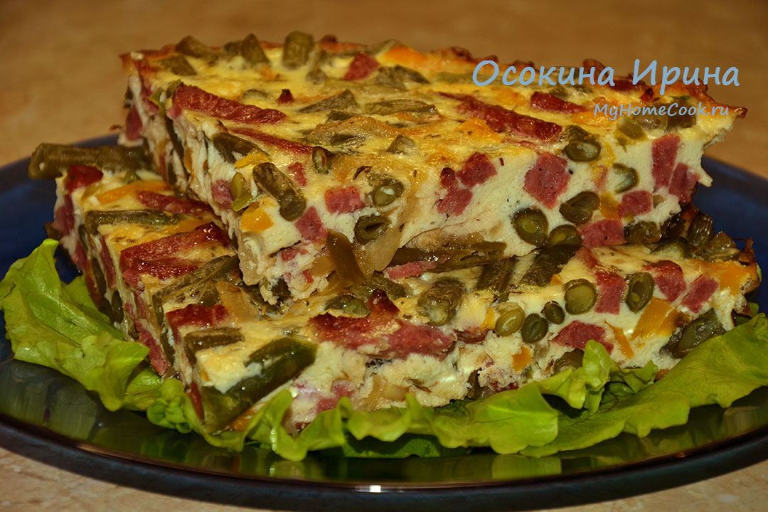 Фасоль с колбасками в омлете