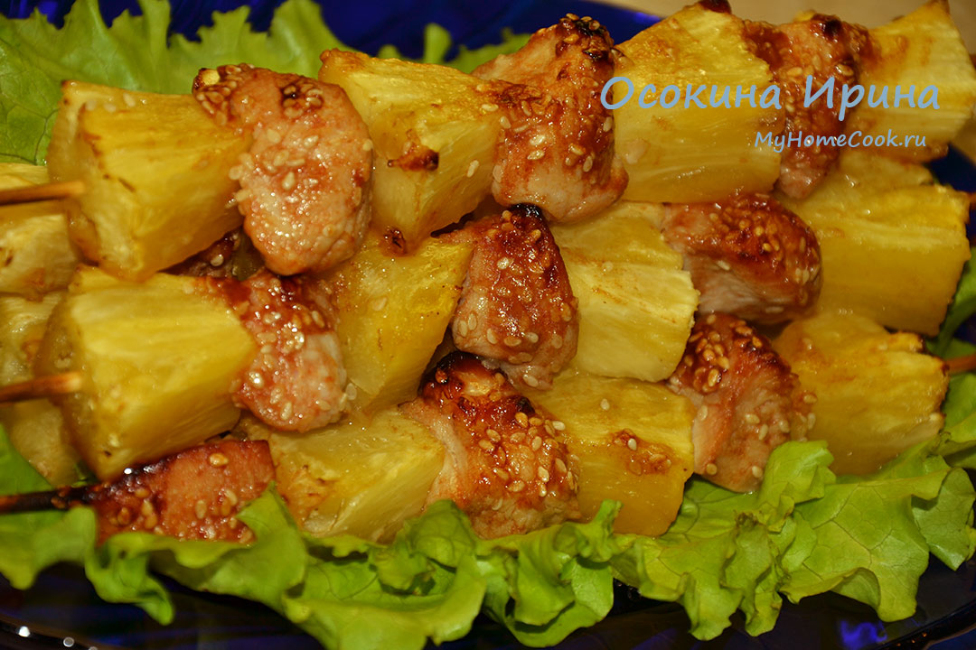 Шашлычки в духовке - любимая зимняя тема в нашей семье. Сегодня такие: в миске смешала 2 ст.л. оливкового масла, 3 ст.л. кисло-сладкого соуса, соль и перец по вкусу, 1 ст.л. кунжута и промешала до однородности. 0,5 кг медальонов индейки (кусочки мякоти из-под крыла) порезала средне-крупными кусочками и замариновала в подготовленной смеси на пару часов. В это время очистила ананас, вырезала сердцевину, а мякоть порезала на кусочки. По истечении времени нанизала, чередуя, индейку и ананас на заранее замоченные в воде деревянные шпажки, переложила на решётку и запекла в духовке, разогретой до 180 градусов, в течение 25 минут. Просто, очень вкусно и даже полезно)