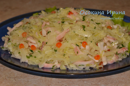 Нашинковала тонко 1/2 кочанчика капусты, посолила, помяла, сложила в сотейник, влила около 100 - 150 мл воды и тушила под крышкой 12 минут, сняла крышку, выпарила остатки воды в течение минуты, влила 100 мл жирных сливок и тушила около 5 минут. В это время в другом сотейнике распустила 50 г топлёного сливочного масла, добавила горсть рубленной петрушки и 3 измельчённых зубчика чеснока, промешала, прогрела несколько секунд, добавила 5 резаных соломкой кальмаров, промешала, прогрела всё вместе минутку, добавила в капусту, промешала, через минуту добавила 1 ст.л. с верхом красной икры, снова промешала и сразу подала. Бесподобная вкуснотища! Вкуснее блюда с кальмарами ещё поискать надо)