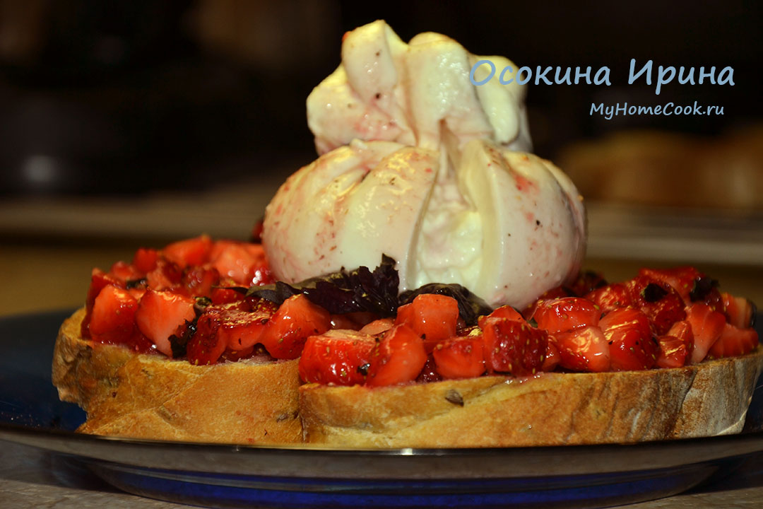 Клубника для нас, уральцев, это символ лета. Поэтому сейчас, когда клубника появилась только в продаже, но уже ароматная, вкусная и доступная по цене, она прочно закрепилась у нас на столах. Сегодня так: порезала мелко горсть листьев фиолетового базилика, добавила 1 ч.л. с верхом коричневого сахара и промешала, добавила 300 г резаной клубники, сбрызнула красным винным уксусом, поперчила, промешала и немного настояла, чтобы клубничка дала сок. Ломтики мультизлакового хлеба, подсушенного на сухой горячей сковороде, попарно разложила по тарелкам, поверх разложила подготовленную клубнику, на середина установила по шарику сыра "Буррата" и полила выделившимся соком, надрезала шарики сыра и подала. Бесподобное сливочно-клубничное объедение)