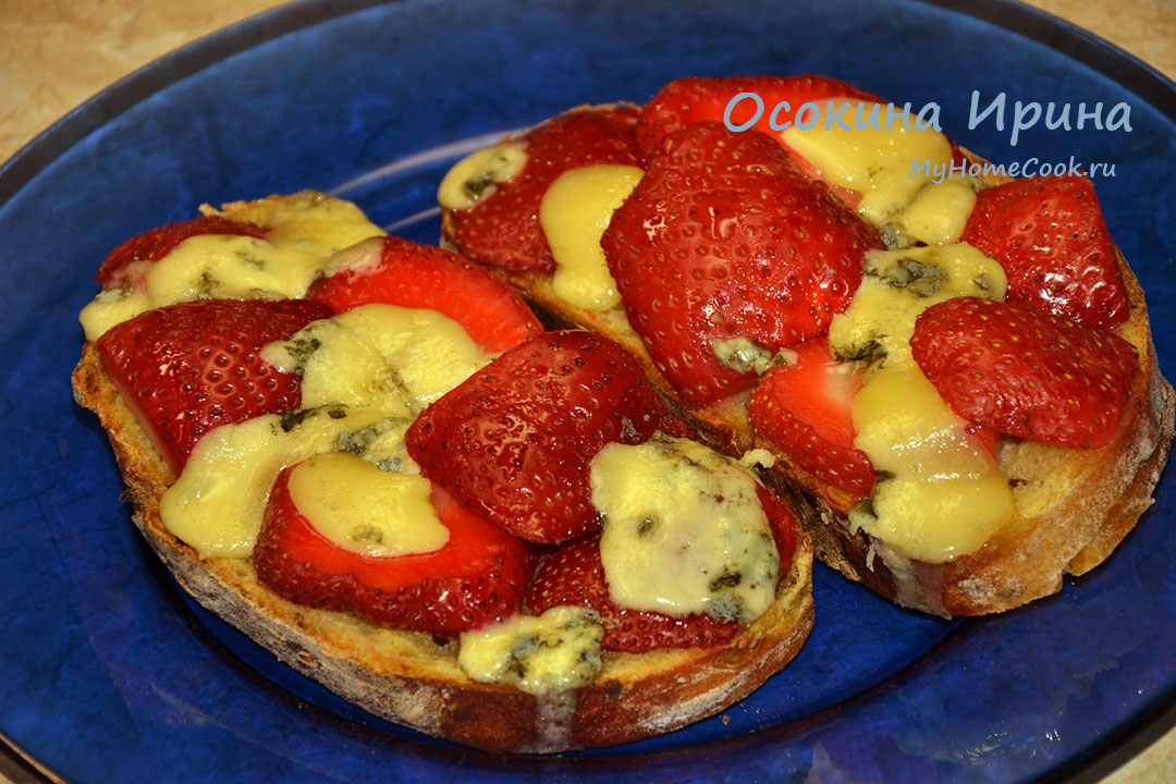Сочетание клубники и сыра с голубой плесенью - это классическое гастрономическое сочетание ароматной сладости и солоноватой пикантности. Обычно к этому сочетанию ещё хорошо подходит грецкий орех, но сегодня вместо орехов я использовала хлеб из смеси различных злаков и семечек. А нагревание ингредиентов в этом случае лишь усиливает вкусы. Получилось вот что: на ломти мультизлакового хлеба уложила резаную ломтиками клубнику, поверх накидала кусочки сыра с голубой плесенью, сбрызнула всё жидким мёдом и запекла в духовке, разогретой до 180 градусов, в течение 5 минут. Просто, но так вкусно с чайком-кофейком)