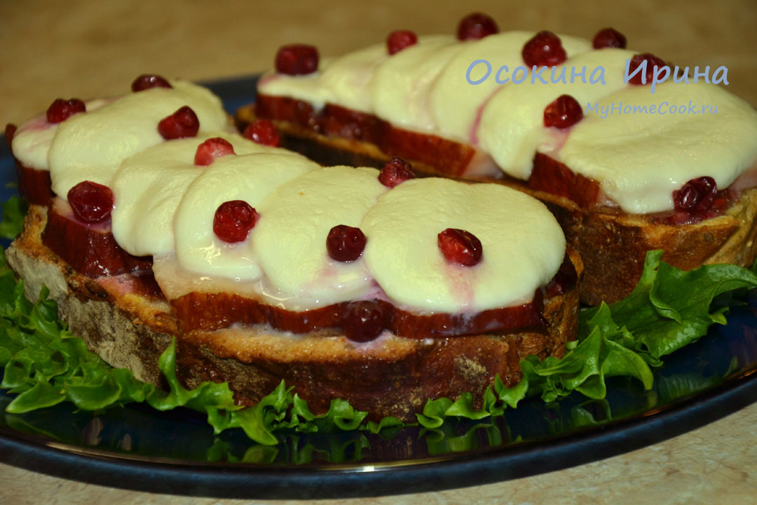 Зимой по приходу с морозца хочется не только горячего чайку, но и чего-нибудь более существенного. Поэтому, пока заваривается чай, я стараюсь приготовить какие-нибудь горячие бутерброды. Сегодня так: ломти мультизлакового хлеба смазала сливовым джемом собственного производства, уложила в форму для запекания, поверх джема выложила не тонкие слайсы копчёной свинины, на них уложила кружочки моцареллы из рассола, украсила замороженными ягодками брусники и запекла всё в духовке, разогретой до 180 градусов, в течение 5 минут до подплавления сыра. Ооочень вкусно нам было! Сочетание сладкого, кислого, солёного и сливочного да на ломте тёплого хлеба)