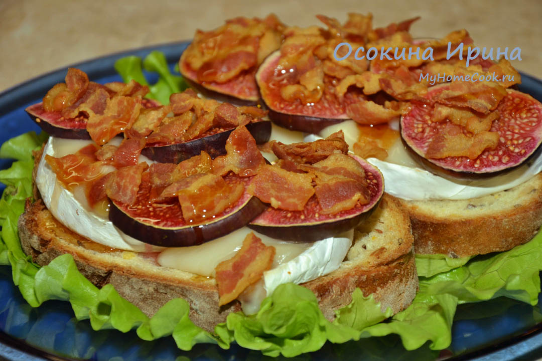 5 полосок бекона порезала, выложила на сухую сковороду, поставила её на огонь, выжарила до хруста, а затем переложила на бумажные полотенца, чтобы снять лишний жир. Кружок сыра "Бри" разрезала плашмя пополам, а затем каждый кружок располовинила, разложила по двум ломтям мультизернового хлеба срезами вверх и друг к другу, поверх выложила кружочки инжира, поверх выложила подготовленный бекон, переложила бутерброды в форму и запекла в духовке, разогретой до 180 градусов, в течение 10 минут, достала форму, переложила бутерброды на тарелку, полила жидким мёдом и сразу подала. Ооочень вкусно получилось)