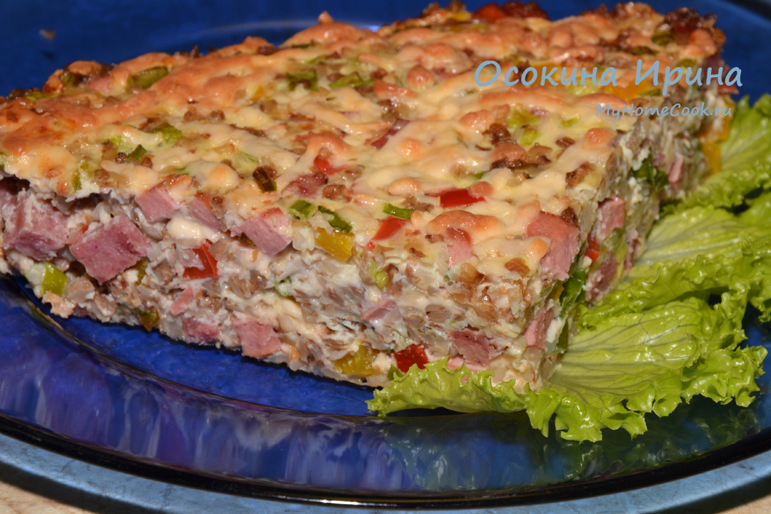 Сегодня запеканка посвящена зачистке холодильника, в котором скопились 1 сарделька, 1 копчёная колбаска, полтора стакана отварной гречки и грамм 150 сулугуни. Получилось из этого всего вот что: в миске взбила 2 яйца, добавила гречку, сардельку и колбаску кубиком, по 1 красному и жёлтому сладкому перцу кубиком, большую горсть резаного зелёного лука и тёртый сыр и всё хорошенько промешала. В сотейнике распустила топлёное масло, выложила подготовленную смесь разровняла и запекла всё в духовке, разогретой до 180 градусов, в течение 25 минут. Просто, вкусно и сытненько) Приятного аппетита
