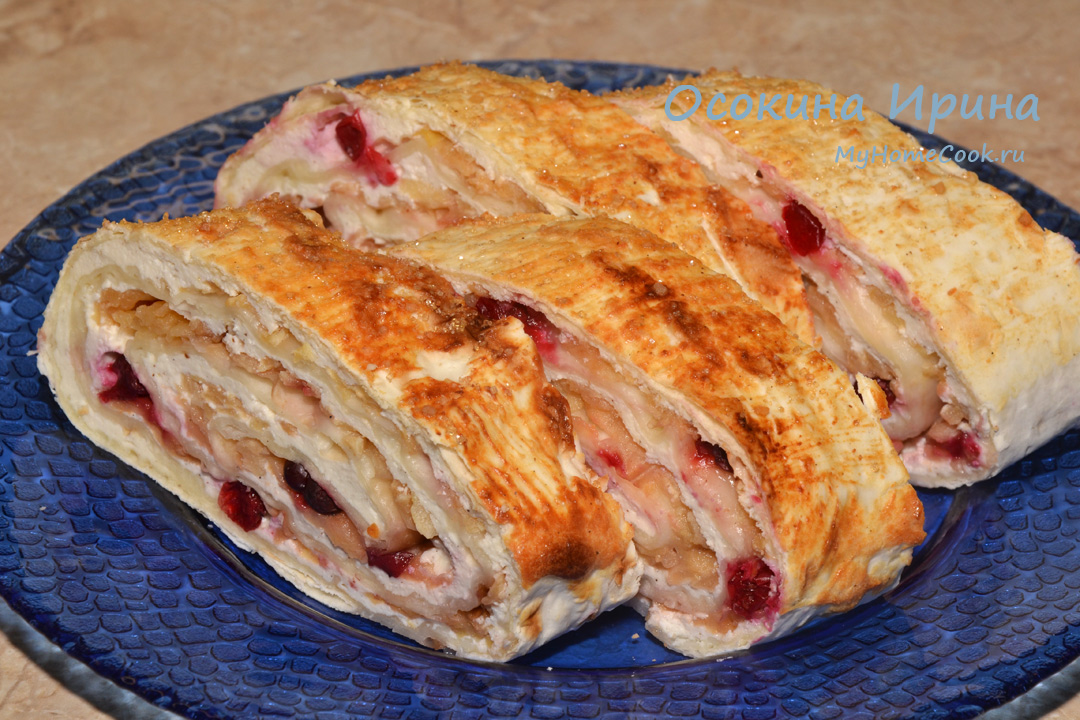 Когда хочется чего-нибудь к чаю, меня частенько выручает тонкий армянский лаваш. В этот раз получилось вот что: в чашу блендера вбила 2 яйца, добавила 400 г мягкого творога, 15 г ванильного сахара, 1 ст.л. коричневого сахара, щепоть соли и пробила до однородности, густо смазала этим лист тонкого армянского лаваша, поверх разложила 3 очищенных от кожицы и натёртых на крупной тёрке садовых яблока, поверх разбросала пару горстей свежей брусники, свернула лаваш рулетом, переложила в форму, смазала остатками творожной смеси, присыпала коричневым сахаром и запекла в духовке, разогретой до 180 градусов, в течение 25 минут. Очень вкусно! К чайку-кофейку просто улёт)