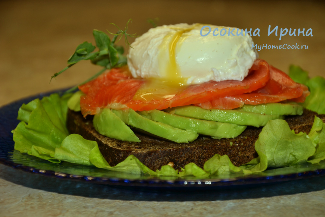 Тут самое важное, чтобы хлеб был именно "Бородинский" иначе вкус будет не так гармоничен. А в целом всё просто. Бородинский хлеб нарезала большими, но не толстыми ломтями, поверх каждого уложила по половине резаного авокадо, на него - 3 ломтика слабосоленой форели, венчала яйцами пашот, украсила микрозеленью и сразу подала. Чтобы сварить яйцо пашот в ковшик со слабокипящей водой добавляю соль, немного яблочного уксуса, ложкой размешиваю воронку, аккуратно вбиваю яйцо и варю почти без кипения 3 минуты, а потом перекладываю на бумажные полотенца промокнуть лишнюю влагу. Вкусное и питательное блюдо хорошо и для завтрака, и для перекуса)