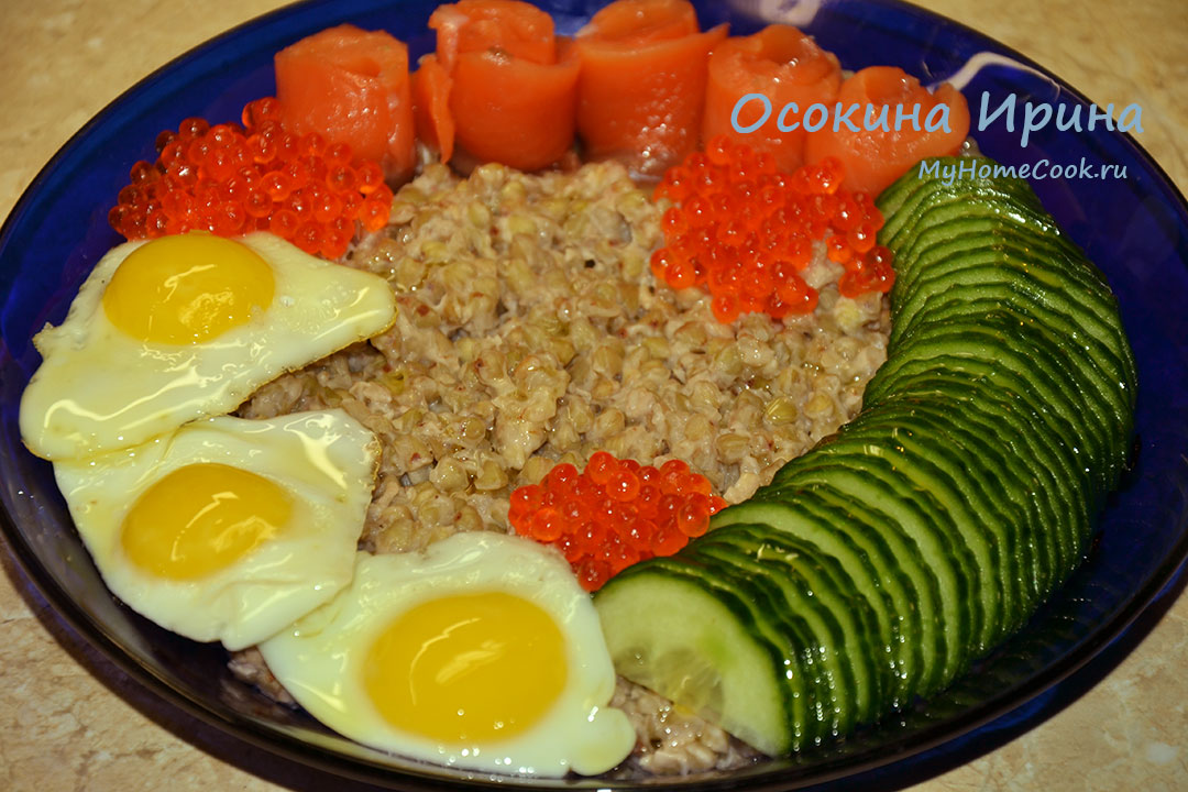Сегодня решён вопрос как совместить в завтраке пользу и праздник: 1 стакан зелёной гречки с вечера сложила в миску, залила холодной водой, оставила до утра, а сегодня промыла и слила на сито. В ковшике довела до кипения 150 мл подсоленной воды, добавила подготовленную гречку, варила около 5 минут на минимальном огне до готовности и выпаривания влаги, добавила 2 ст.л. творожного сыра, промешала, накрыла ковшик крышкой, сняла с огня и немного настояла. В это время пожарила яишенки из перепелиных яиц, нарезала тонкими слайсами слабосоленую сёмгу и порезала полукружьями свежий огурчик. Гречку разложила, по кругу разложила "бутоны" из сёмги, огурец и яйца, добавила красную икру, полила всё хорошим оливковым маслом и подала. Очень, вкусно, очень полезно и весьма изысканно)