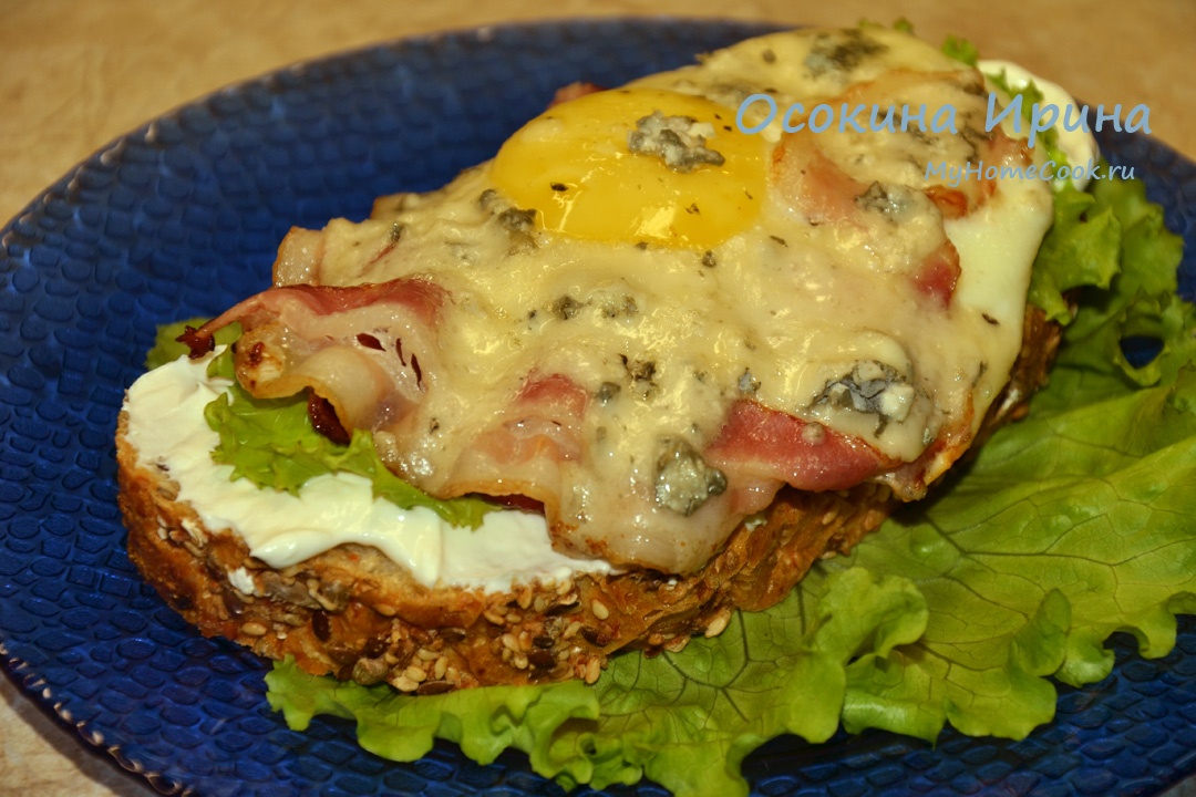 Этот вариант будет хорОш и на завтрак, и на перекус. В сковороду выложила, формируя кольца, попарно полоски бекона, обжарила с обеих сторон, вбила в центр каждого кольца по яйцу, присолила, обжарила чтобы белок прихватился, посыпала кусочками сыра с голубой плесенью и довела до его расплавления. В миске смешала 2 ст.л. творожного сыра и 2 ст.л. сметаны и промешала до однородности, щедро смазала этим ломти мультизернового хлеба, уложила поверх небольшие листики салата, на них - по готовой яичнице и подала. Очень вкусно и сытненько)