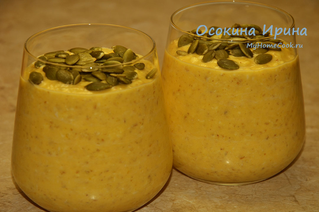 Доедаем последнюю тыкву прошлогоднего урожая: вчера вечером в миске смешала 2/3 стакана смеси "5 хлопьев" (для каши) с 1 ст.л. пшеничных отрубей и 0,5 л кефира, промешала, добавила 1 ст.л. льняного масла (для пользы) и промешала. Сегодня в готовую ночную овсянку добавила 1 стакан тыквенного пюре (тыкву очищаю от кожуры, режу произвольно, отвариваю для мягкости, откидываю, обсушиваю и пробиваю погружным блендером в пюре) и 2 ст.л. жидкого мёда, промешала хорошенько, разложила по сервировочным бокалам, посыпала тыквенными же семечками и подала к завтраку. Очень вкусно и даже полезно)