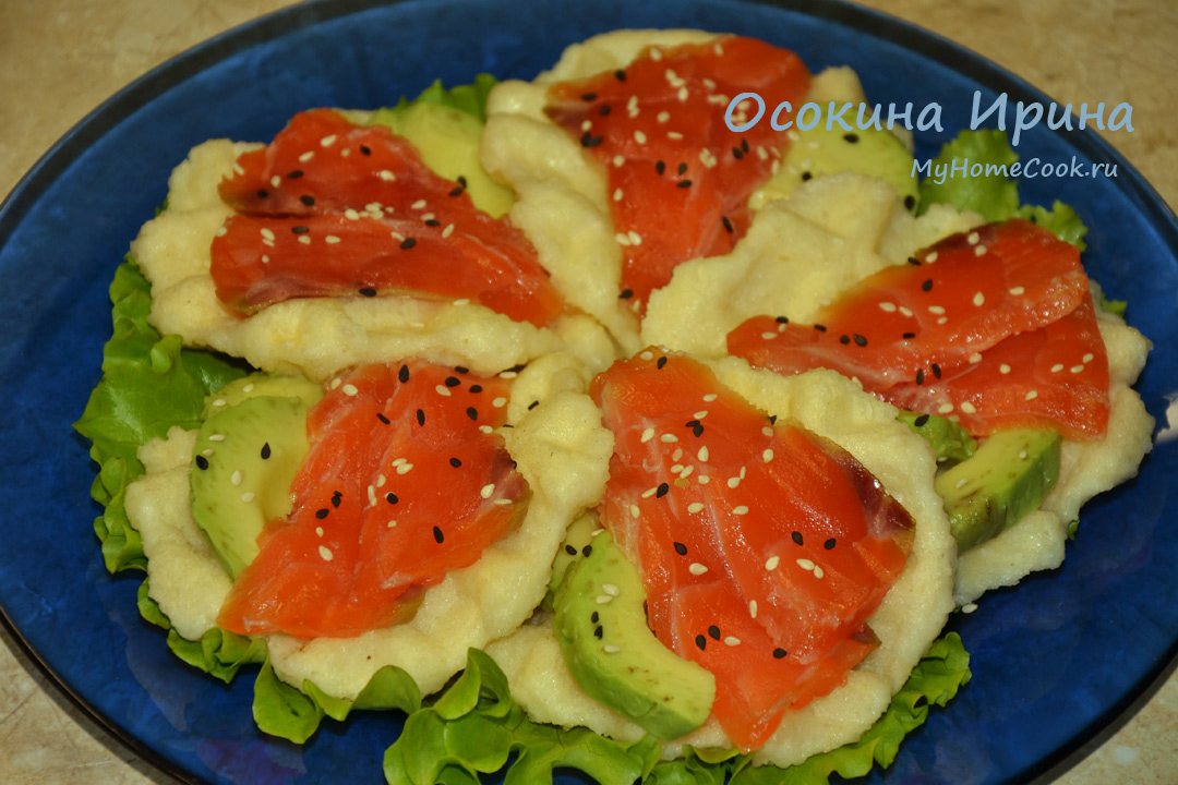 Рисовые вафли с форелью и авокадо