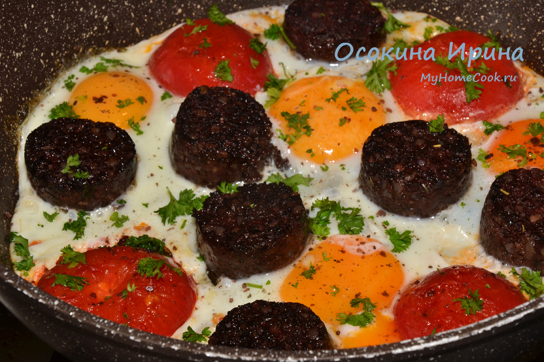 Сегодня вариант быстрого, но сытного завтрака. Всё очень просто: палочку фермерской кровяной колбасы порезала на шайбочки толщиной 1,5 - 2 см. Маленькие помидорки разрезала пополам и сняла с них кожицу. Колбаску и помидоры уложила в разогретый с маслом сотейник, присыпала смесью сушеных ароматных травок, через минуту перевернула, вбила яйца, присолила, присыпала рубленной петрушкой, проготовила чтобы белки схватились, а желтки остались жидкими и подала к завтраку. Просто по-деревенски, но ооочень вкусно и питательно)