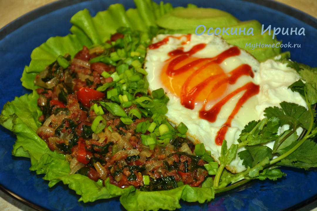 Опять холодно, опять хочется на завтрак чего-то сытного и согревающего. Поэтому завтрак сегодня такой : в сотейнике обжарила 1 резаную луковицу, добавила 1/2 стакана измельчённой острой копчёной колбаски, пару горстей резаного шпината, обжарила до его оседания, добавила горсть резаных помидорок черри, 1 измельчённый зубчик чеснока, 1/2 банки красной консервированной фасоли, промешала, прогрела, разложила по тарелкам, добавила по половинке авокадо, по жареному яйцу с непрожареным желтком, полила его соусом "Шрирача", затем добавила по 1 ст.л. сметаны, по паре веточек кинзы, посыпала резаным зелёным луком и подала. Очень вкусно и насыщенно! Завтрак удался)